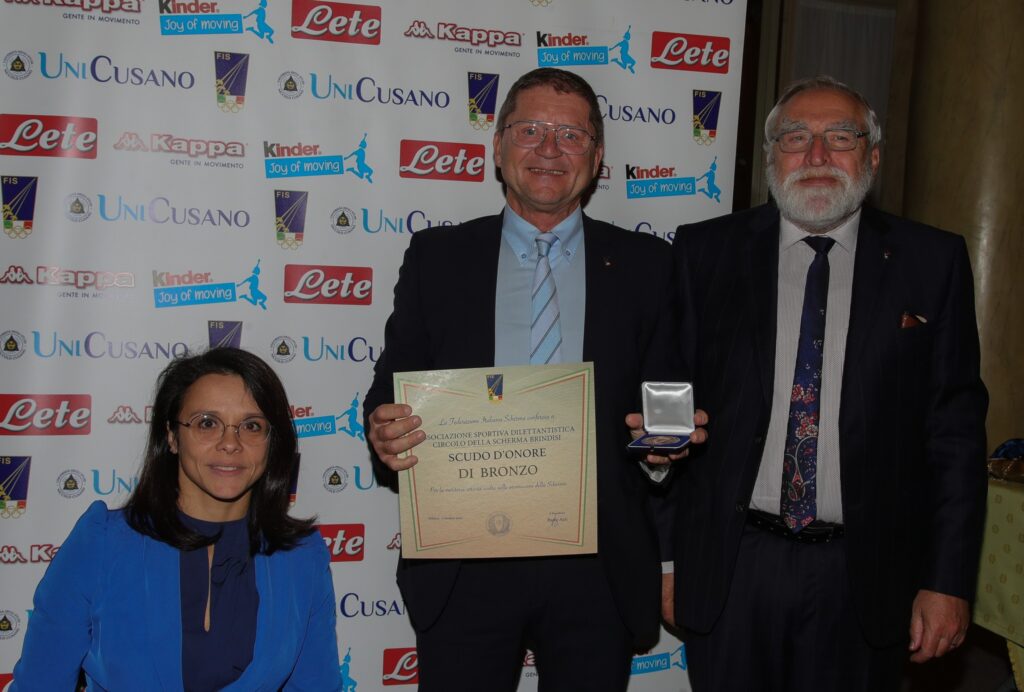 Circa ottanta i premiati nel corso della cerimonia: fra di essi due club pugliesi, due atleti e due tecnici della nostra regione. Hanno infatti ricevuto lo Scudo d’onore di bronzo il Circolo della Scherma Brindisi e l’Accademia di Scherma Lecce; Lama d’onore d’oro per il plurititolato sciabolatore foggiano Luigi Samele e Lama di bronzo per l’emergente Emanuele Nardella, argento nella sciabola maschile a squadre ai Campionati Europei Giovani di Novi Sad; Maschera d’Onore d’oro per il foggiano Andrea Terenzio, Maestro di Gigi Samele, e Maschera di bronzo per il responsabile tecnico del Circolo Schermistico Dauno Benedetto Buenza, già nel giro delle Nazionali azzurre.