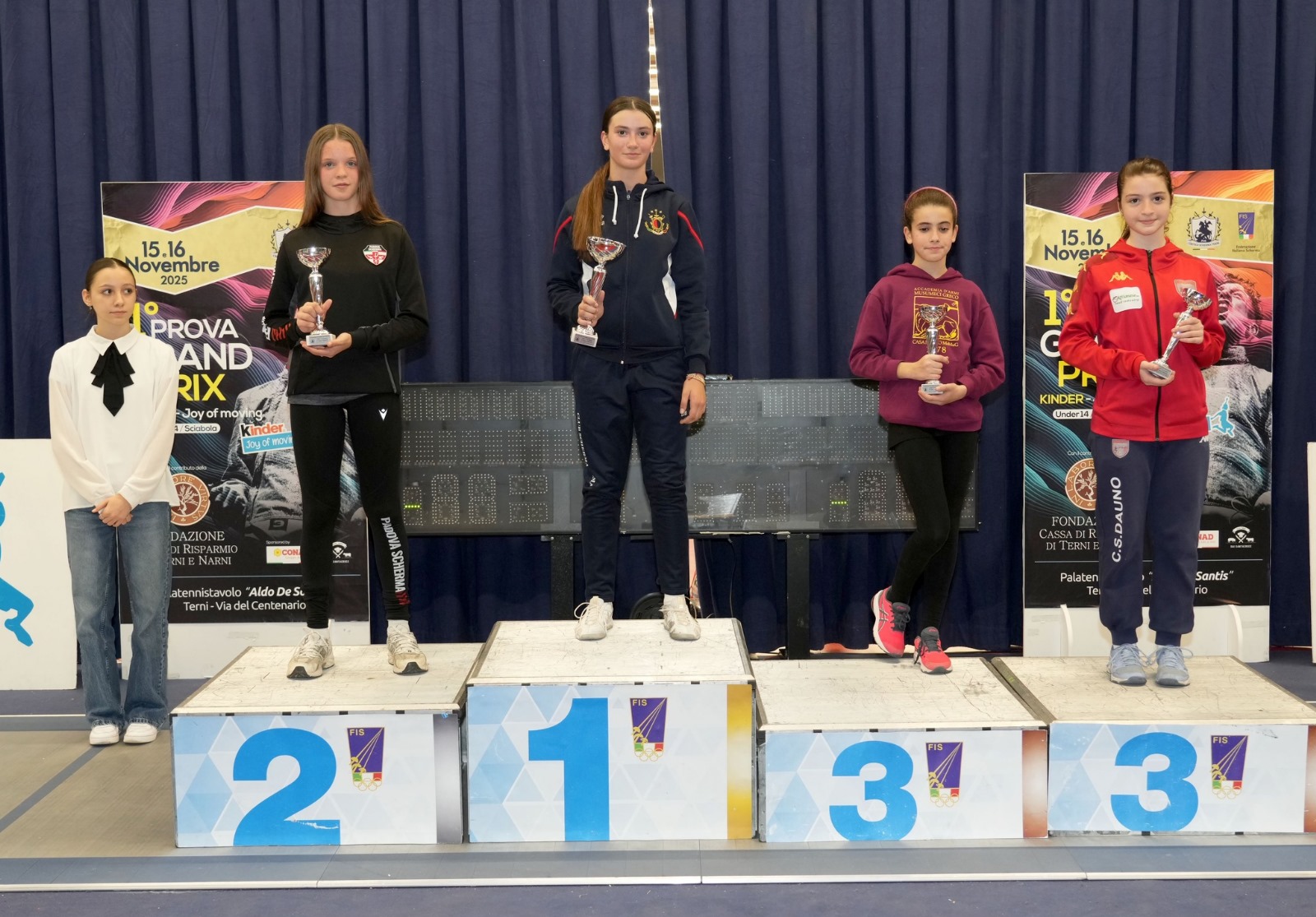 Terzo posto nelle Ragazze per Sofia Carola Di Michele del Circolo Schermistico Dauno, anche lei entrata in tabellone direttamente dai sedicesimi, che supera le atlete del Circolo Scherma Lametino Anna Bertucci per 15-8 ed Amelie Signore per 15-6 poi elimina la testa di serie numero uno Miriam Sementilli (Scherma Ariccia) per 15-13 ma in semifinale cede con lo stesso punteggio nei confronti di Rita Barbujani (Padova Scherma). Di Michele condivide il terzo gradino del podio con Rahel Valerio dell’Accademia d’Armi Musumeci Greco di Roma mentre in finale Melissa Raggi del Club Scherma Roma batte Barbujani per 15-10. Buoni piazzamenti anche per Chloe Althea Rita Tricarico del Club Scherma San Severo (dodicesima), Ginevra Lioce del Dauno (sedicesima) e Matilde Borraccino della Scherma Trani diciannovesima; Aurora Monaco del Circolo Schermistico Dauno e Noemi Finizio del Club Scherma San Severo escono nei trentaduesimi.