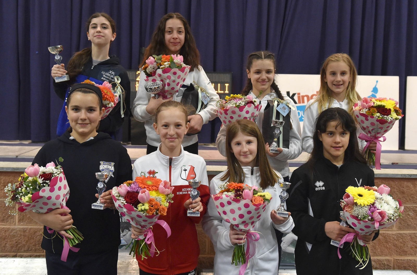 Comincia Martina Zezza delle Lame Azzurre Brindisi, seconda nelle Bambine: nel suo percorso ha sconfitto 10-7 Beatrice Bertolo (Club Scherma Castelfranco Veneto), 10-8 Olivia Tazzioli (Penta Modena), 10-3 Ada Maria Gravina (Cus Catania), 10-5 Giulia Corazza Rubin (Verona Scherma) e Giulia Gallo (Scherma Doc Varese) all’ultima stoccata ma in finale ha perso col punteggio di 10-5 da Viola Martini (Circolo della Scherma Terni). Le altre atlete pugliesi in gara erano Annarita Fumai del Club Scherma Bari, uscita al secondo turno, ed Olivia Orofalo delle Lame Azzurre Brindisi, fuori al primo turno.