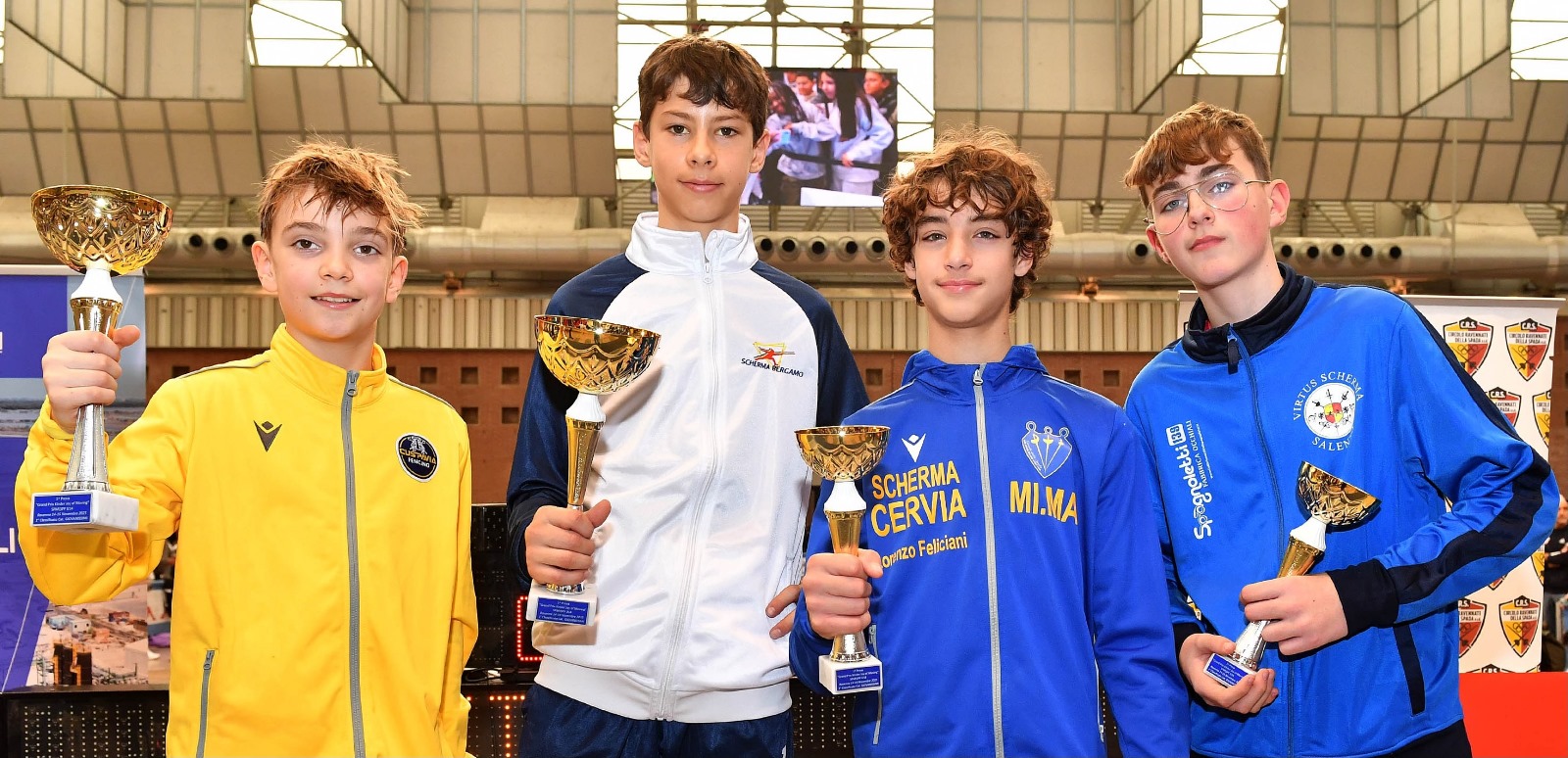 Nei Giovanissimi Iacopo Moschettini della Virtus Scherma Salento è terzo: nel suo percorso ha sconfitto Tommaso Enrico (Delfino Ivrea) per 10-1, Giulio Porcelli (Pisa Scherma) per 10-8, l’altro pisano Jacopo Pacini per 10-1, Daniele Romano (Club Scherma Formia) per 10-8 e Sigismondo Palmieri (Accademia di Scherma Spoleto) col medesimo punteggio ma in semifinale soccombe contro Carlo Bernieri del Cus Pavia per 10-5. Nella stessa gara Mattia Ianne del Club Scherma Lecce è 12°; Loris Lanciano del Club Scherma Lecce e Matteo Nucita della Virtus Scherma Salento si fermano nei trentaduesimi; Francesco Simeone del Club Scherma Taranto ed Edoardo Pantaleo della Virtus Scherma Salento out al secondo turno, Federico Bucci del Club Scherma Taranto ed Alberto Paolo Intelligente del Club Scherma Lecce escono di scena al primo turno.