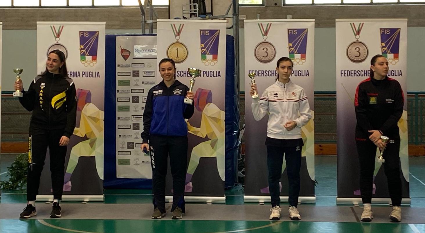 Nel tabellone femminile vince Lucrezia Orlando delle Lame Azzurre Brindisi che in finale ha la meglio per 15-9 su India Briganti del Club Scherma Taranto. Anna Gadaleta del Club Scherma Bari e Vittoria Demma del Club Scherma Lecce completano il podio e l’elenco delle qualificate Giovani. Demma si qualifica anche per le Cadette assieme a Federica Di Giorgio (Circolo della Scherma Brindisi), Anna Di Gioia (Club Scherma Bari) e Ginevra Mangè (Accademia Scherma Lecce).